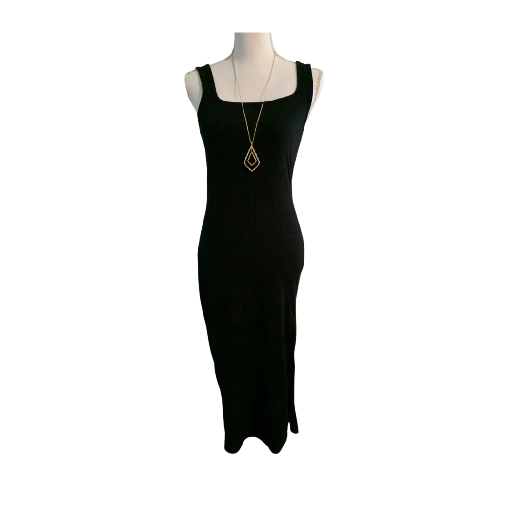 Black Sleeveless Square Neck Ribbed Midi Dress with Front Slit