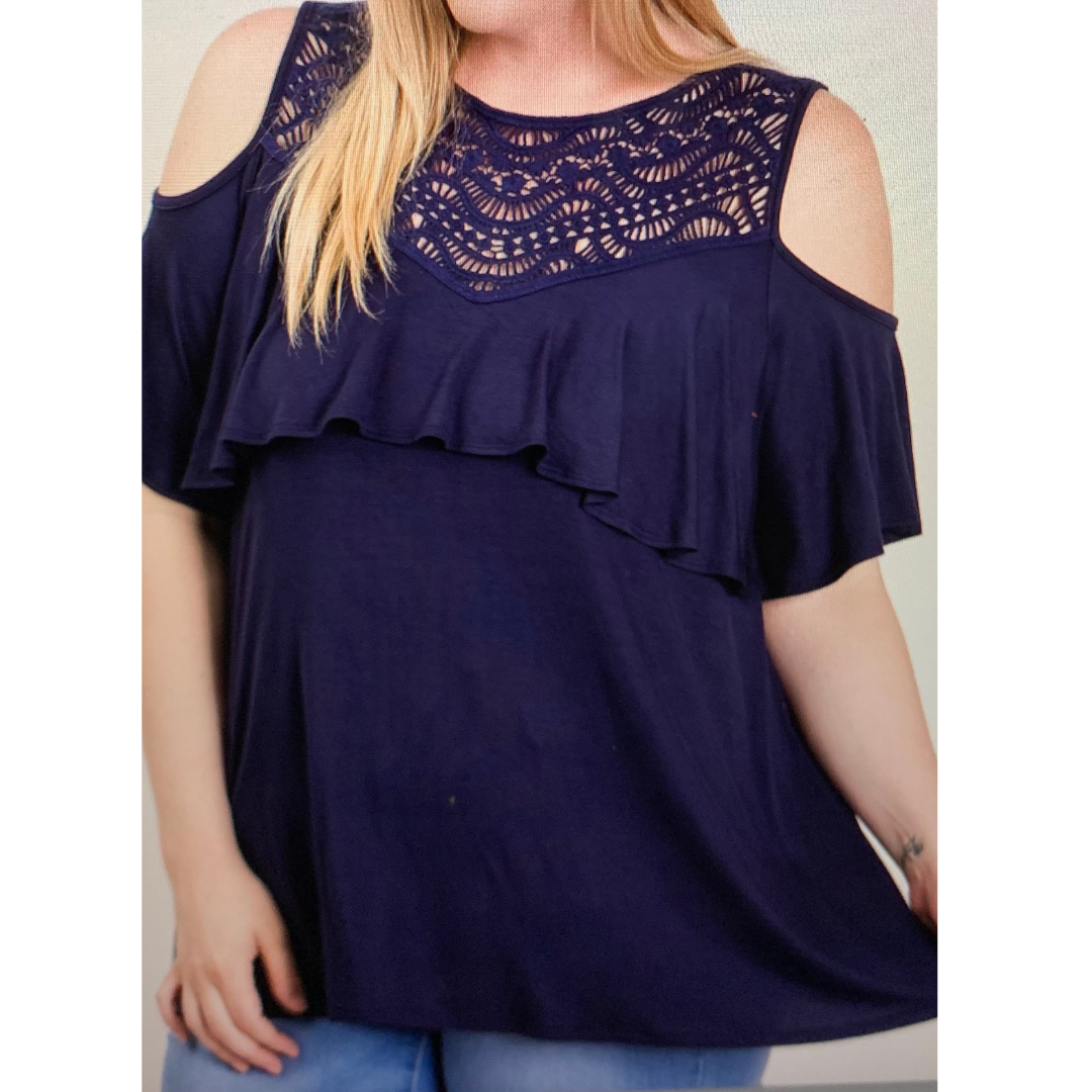 Crochet Trim Ruffles Cold Shoulder Top