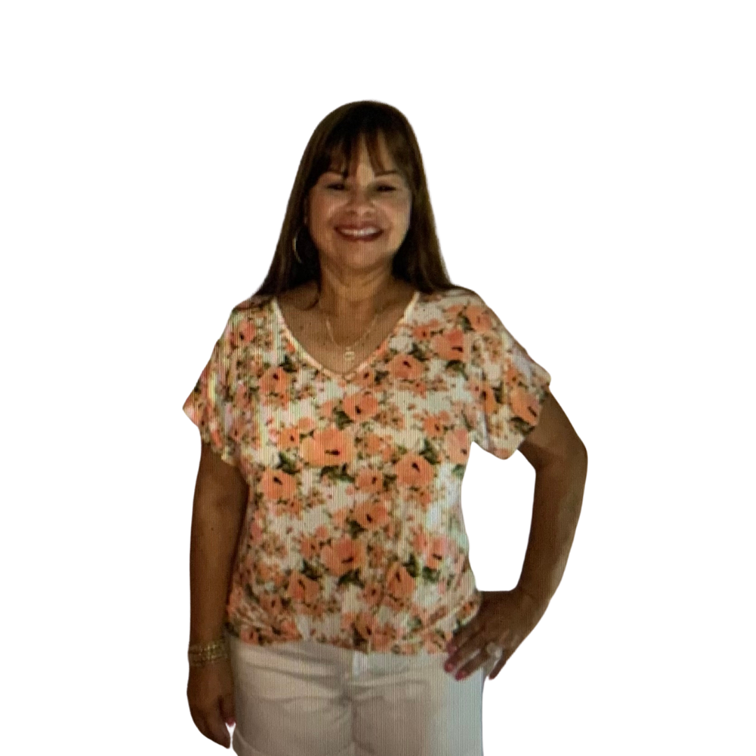 Floral Multi Design Top. V-Neck knotted hem, half sleeves and soft comfortable light weight material. Perfect for casual top.