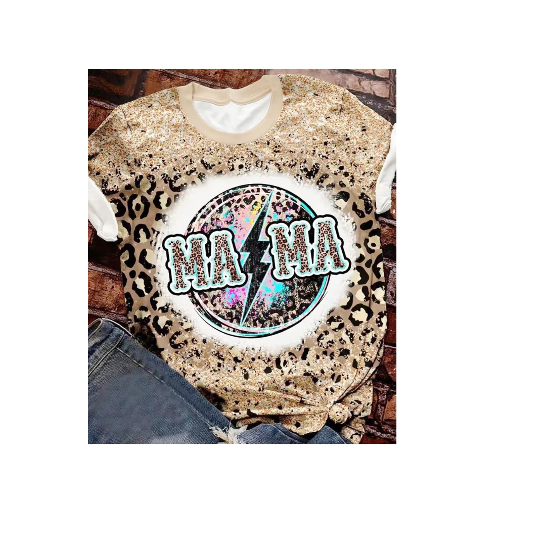 Mama leopard pattern, thunder bolt crew neck short sleeve western vintage apparel summer t-shirts 100% polyester