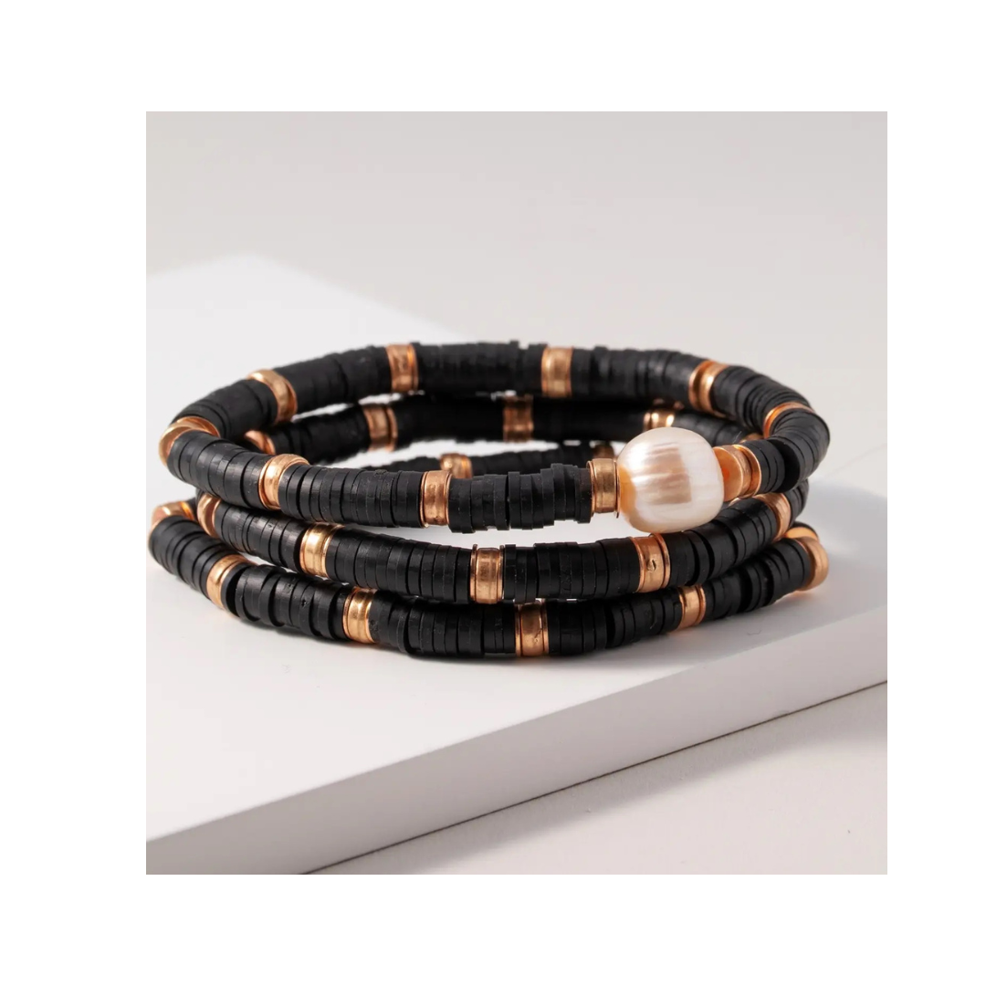 Rubber disc beaded stretch bracelet set with pearl glass charm detail. Approx: 4" Material: zinc, brass, gold plated, rubber discs, pearl Lead compliant, nickel free