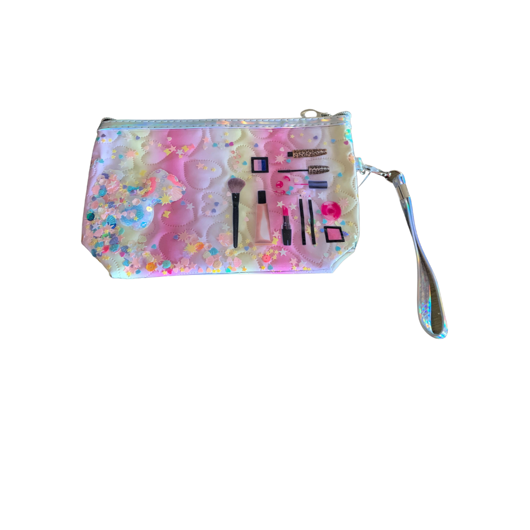 Makeup Printed Shaker Glitter Pouch - Zipper Closure - with a Detachable Wrist Strap