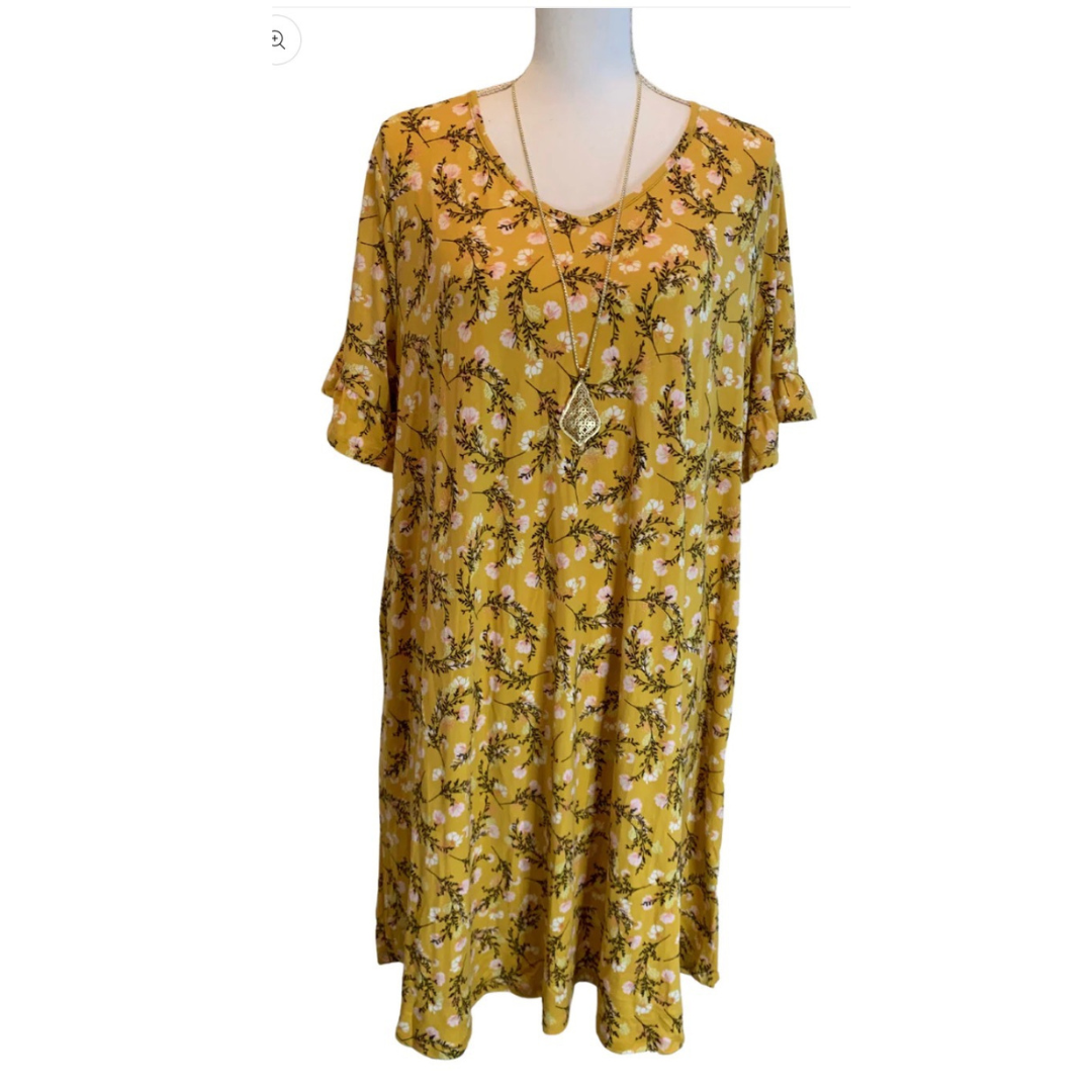 Curvey V-Neck Short Sleeve Ruffle Detail Dress with Side Pockets